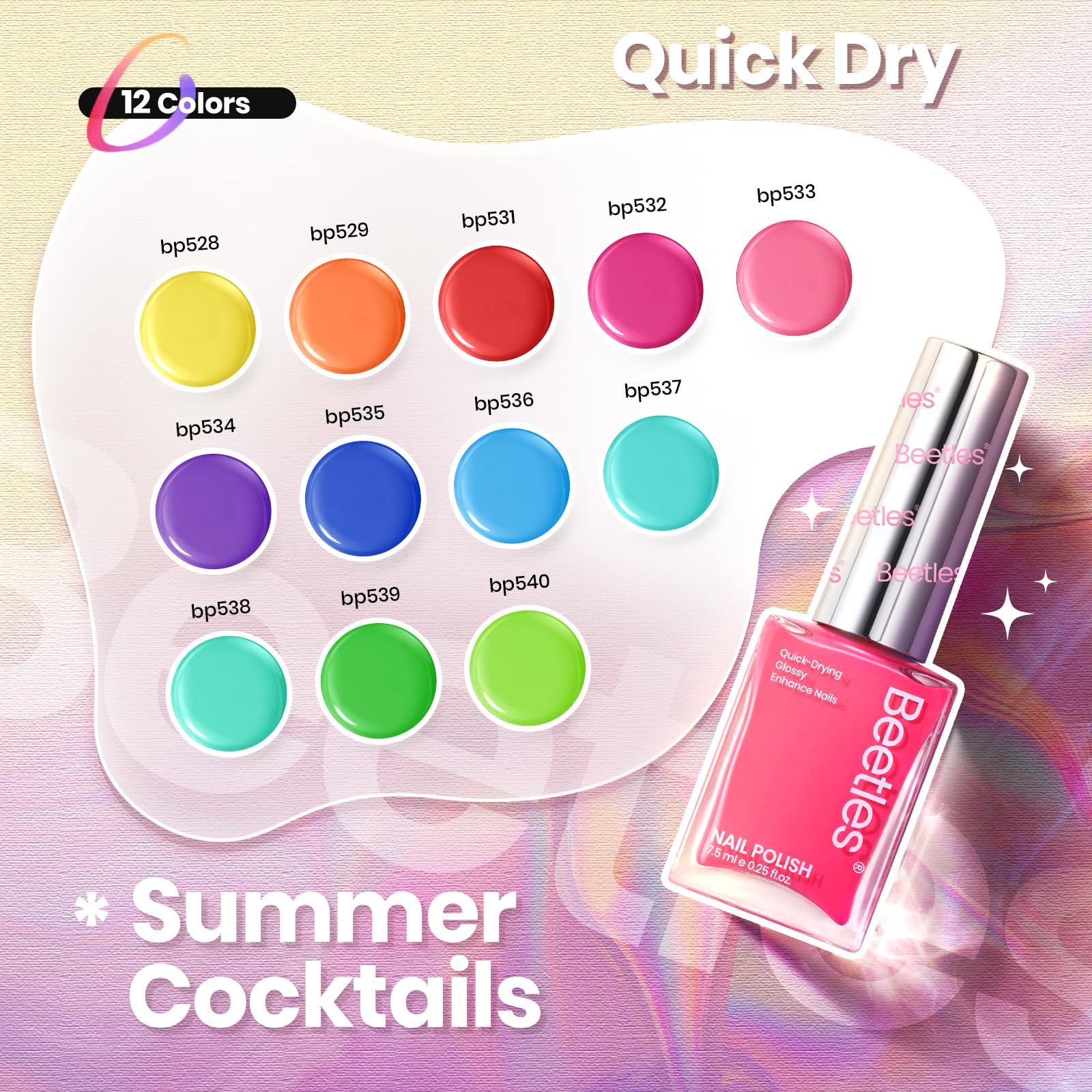 - 【Long-Lasting Shine】Beetles quick dry nail polish enjoys a bright color and high gloss that lasts for at least 8 days without discoloration or paint peeling. It is very durable, and is an ideal choice for festivals or special occasions, as well as an ideal gift for nail lovers! It need to be used with a base coat and top coat!This item does not include base&top coat, which needs to be purchased separately.