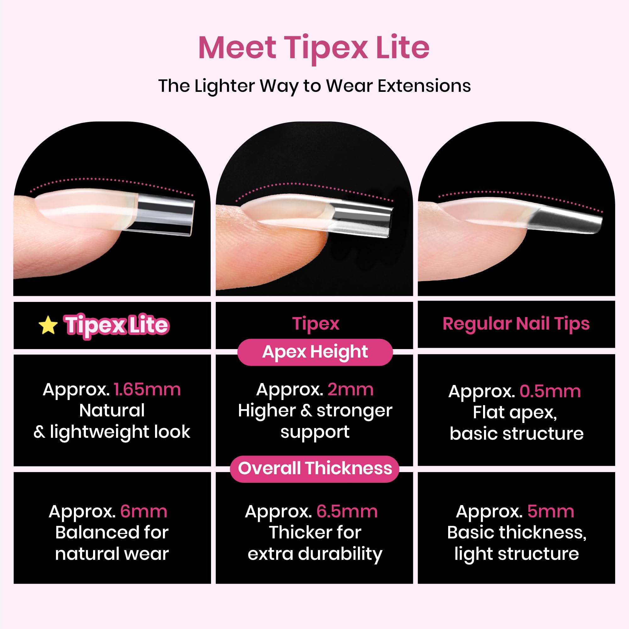 - Built-In “Lite instant apex” for Instant Strength & a Natural Look.No bulky builder gel needed. Tipex pre-sculpted Lite instant apex adds salon-level structure and durability directly into the tip. Get a strong, beautiful arch without the heavy look—just glue and go.